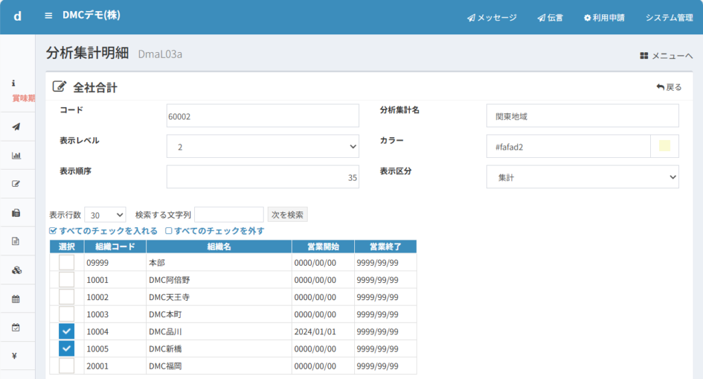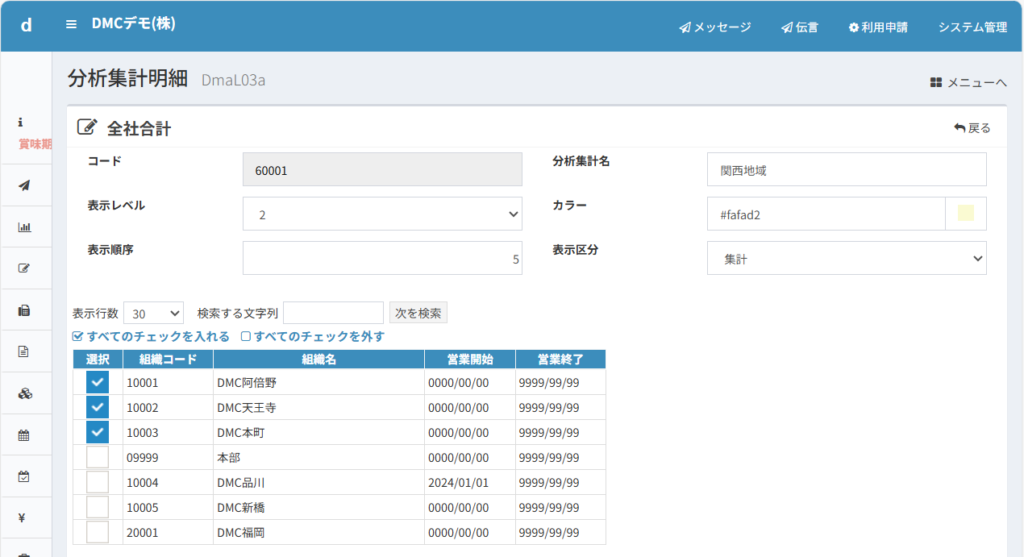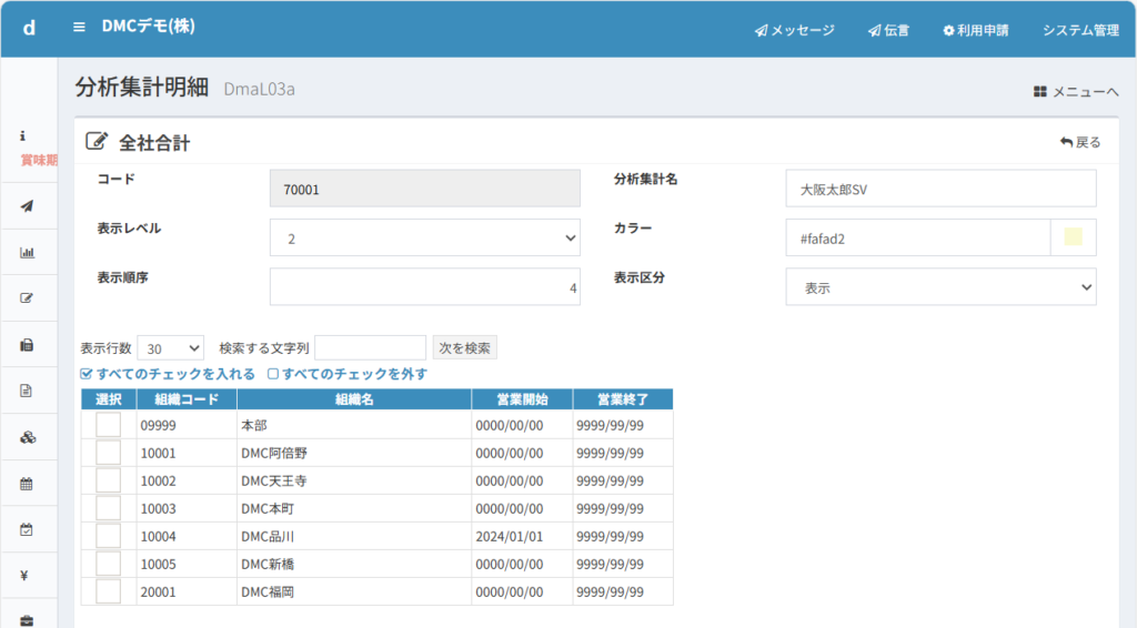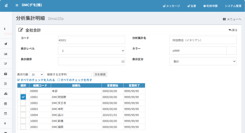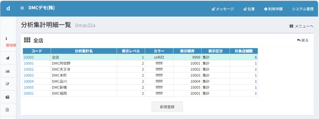 この設定は、店舗コード10001のDMC阿倍野について、分析パターン用のコード40001で店名も「阿倍野店」という略称で登録しています。