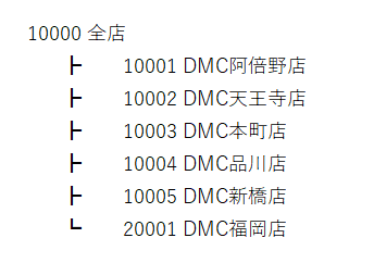 このように、「10000 全店」という集計行に、10001~20001までのすべての店舗が集計されるという登録内容になっています。ツリー構造にすると以下のようになります。