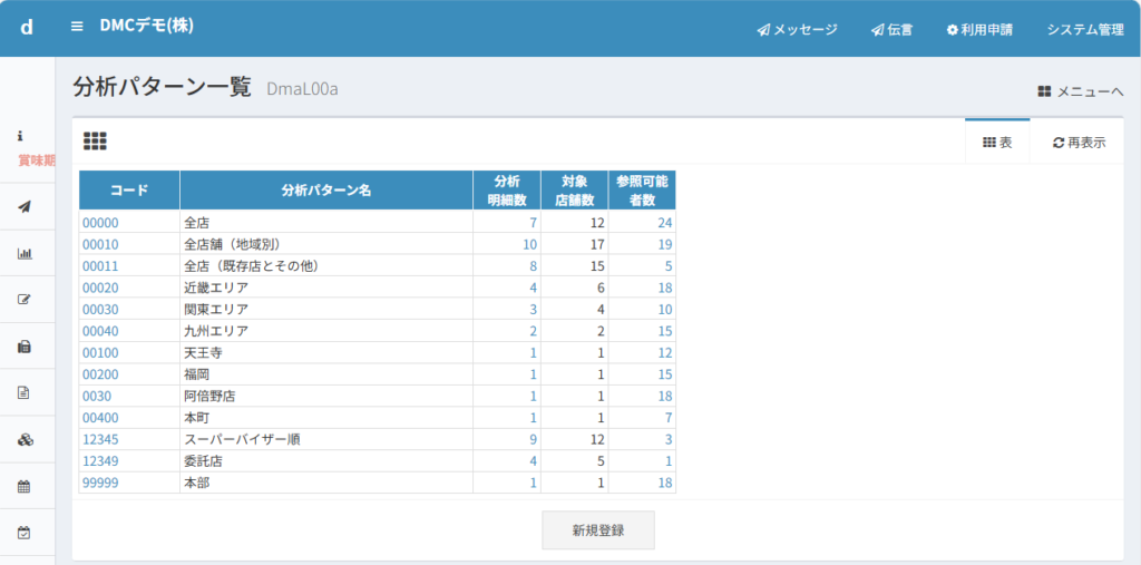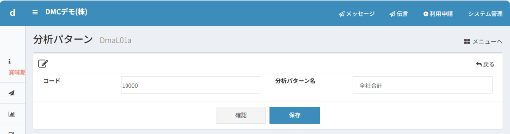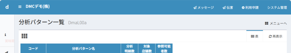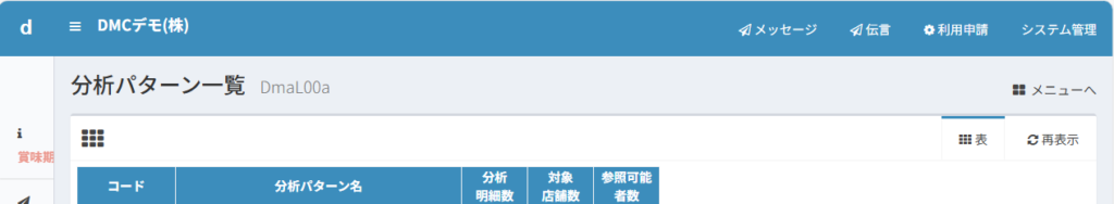 メニューから「マスター管理」→「分析関係」→「分析パターン一覧」と進みます。