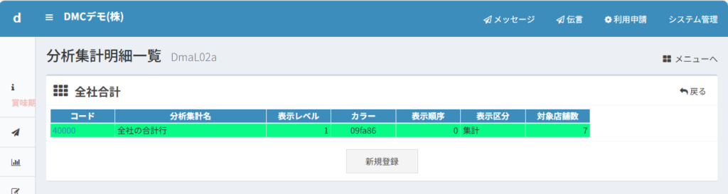 初めて使用する場合は分析パターンは登録されていませんので新規登録ボタンを押し、以下のように全社合計という分析パターンを登録します。