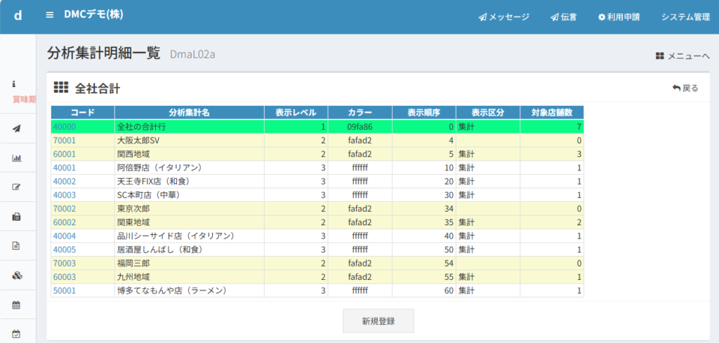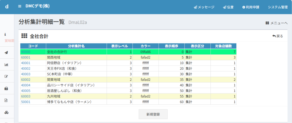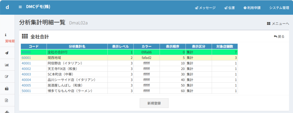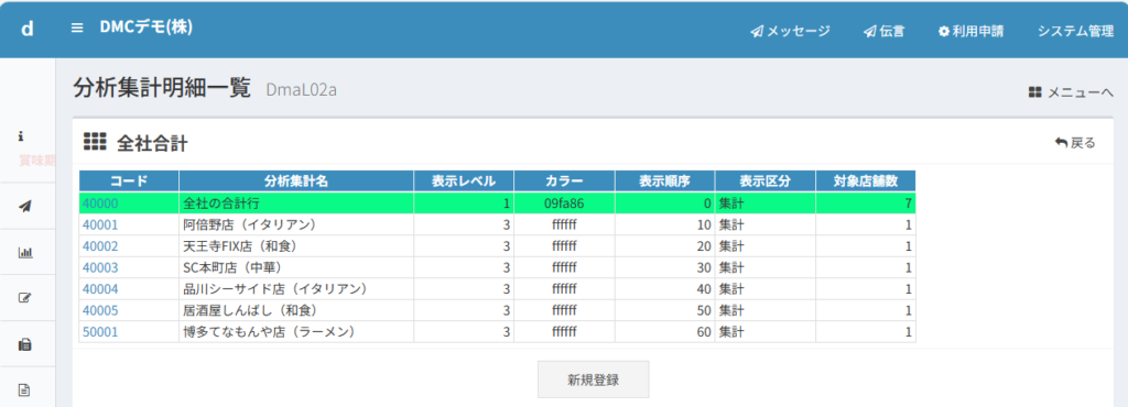 分析帳票などに表示したい集計名称を新しく設定できます。店舗名が長すぎるときに略称などで登録することができます。