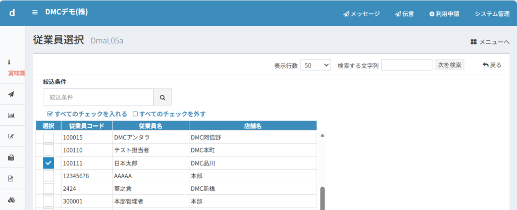今登録した全社合計の「参照可能者数」の0表示をクリックして、訂正ボタン、従業員選択ボタンをおして、従業員を選びます。ここでは日本太郎さんを選びます。