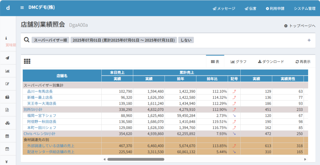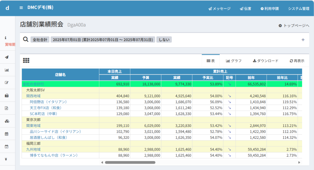 このように、その行に集計するのはどの店舗の売上か、という集計対象を設定して、集計行を並べていくことで分析パターンはできています。集計行の店舗名も自由に変えられるので、経営管理しやすい表示項目に変更することができます。