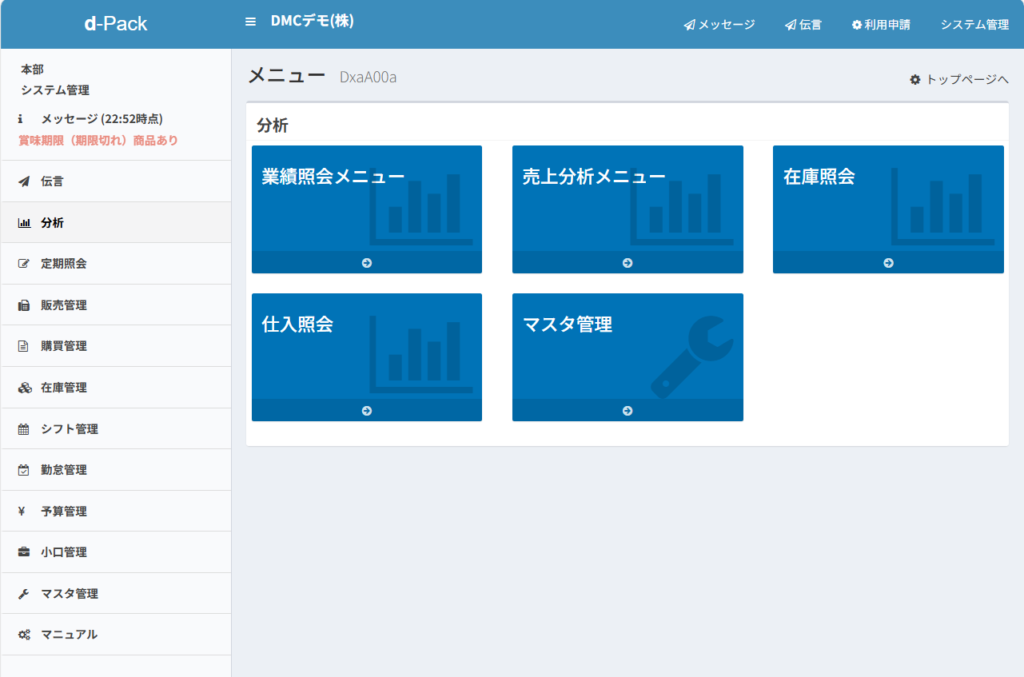 メニューというのはログインしたときの左側に表示されている「分析」「在庫管理」などの機能選択欄のことです。下図の画面例ではすべてのメニューが表示されています。