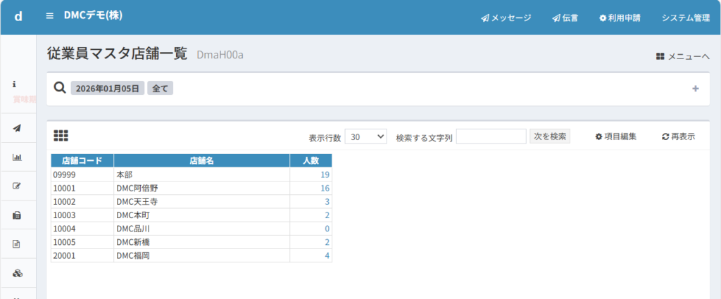 新しく登録したい店舗の「人数」欄の数字をクリックして、従業員マスタ一覧を表示します。ここでは、DMC品川店の人数「0」をクリックしました。