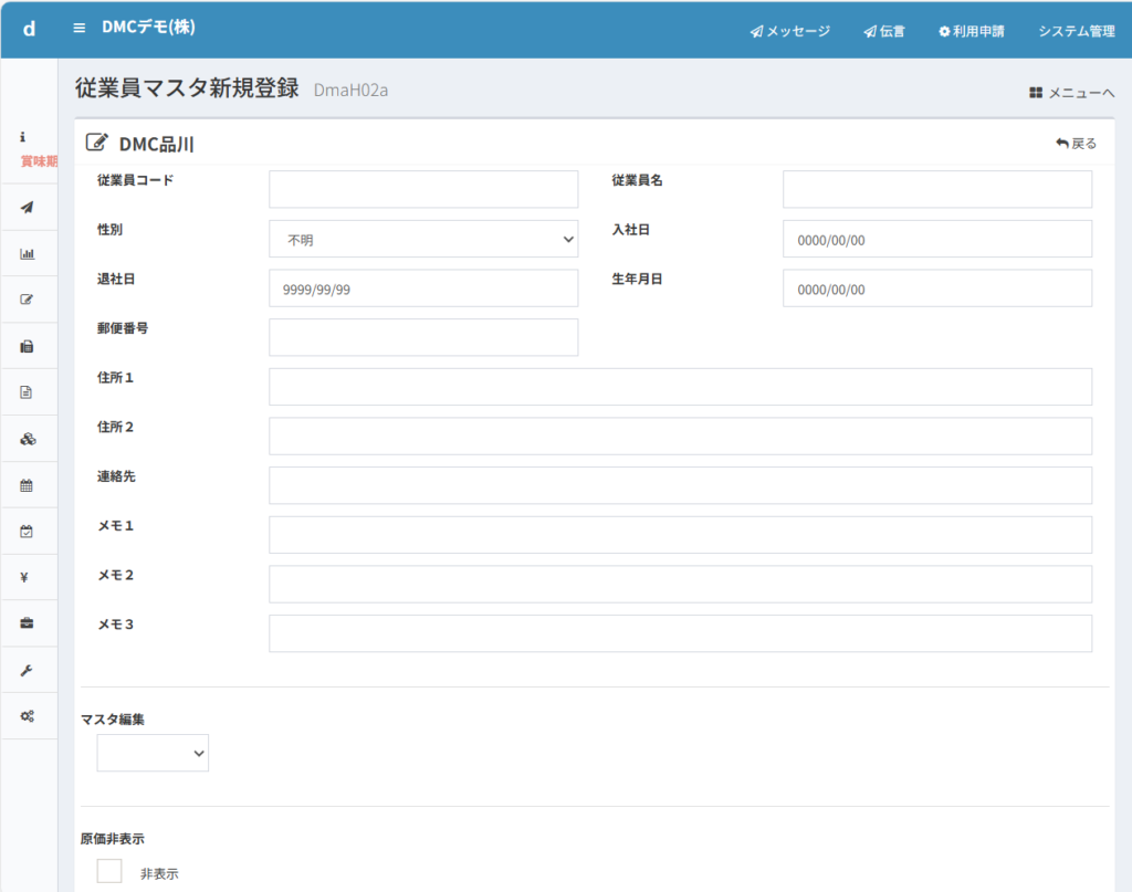空白のまま(ブランク)の状態のときは、マスタ管理というメニューが表示されなくなります。この従業員にマスタメンテナンスをする権限を与えない場合は、空白のままブランクにしておいてください。