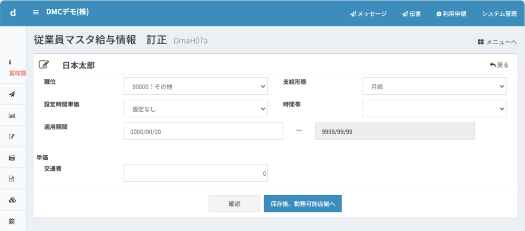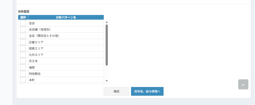 給与情報画面では、他社の給与計算システムにデータを渡したり、業績照会での人件費の概算計算に使用する情報です。ここでもこのまま「保存後、勤務可能店舗へ」に進みましょう。