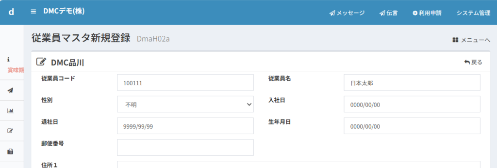 この画面で必須入力項目は、従業員コードと従業員名だけです。