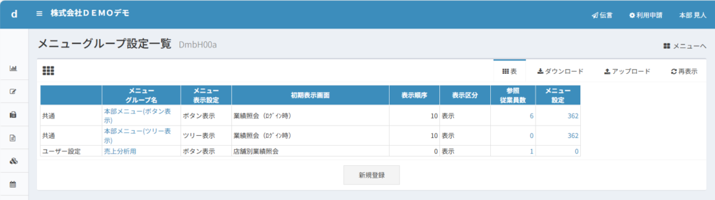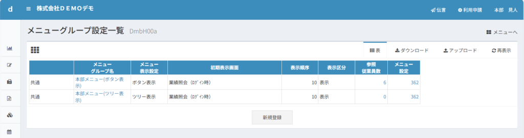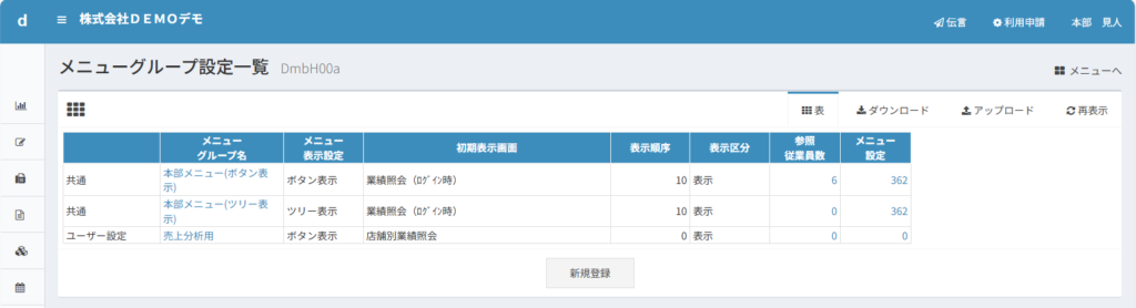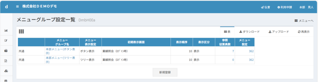 ですので、すぐにさきほどの画面に戻って、新規登録を押して、日本 太郎さんの使用するメニューを作ってあげましょう。このように機能制限をしたメニューのことをメニューグループと呼んでいます。使用できる機能(メニュー)をまとめているグループという意味です。