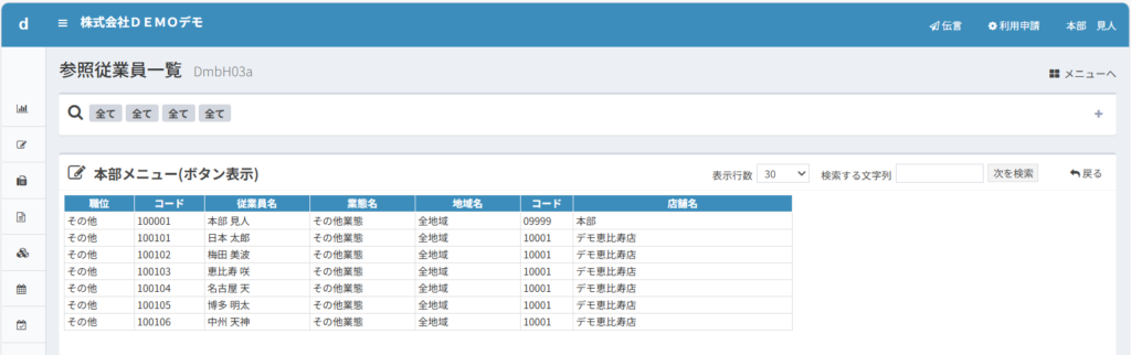 ここには、初期設定で登録されている共通メニューが表示されています。そして、1行目の本部メニュー(ボタン表示)の参照従業員数の欄に、そのメニューを使用している従業員の人数(7人)が表示されています。