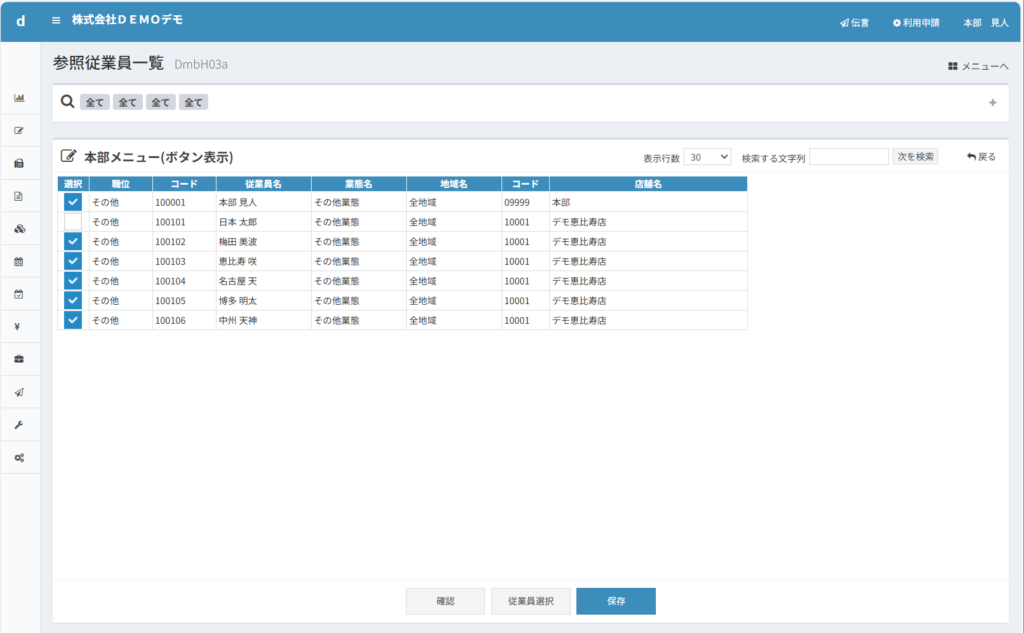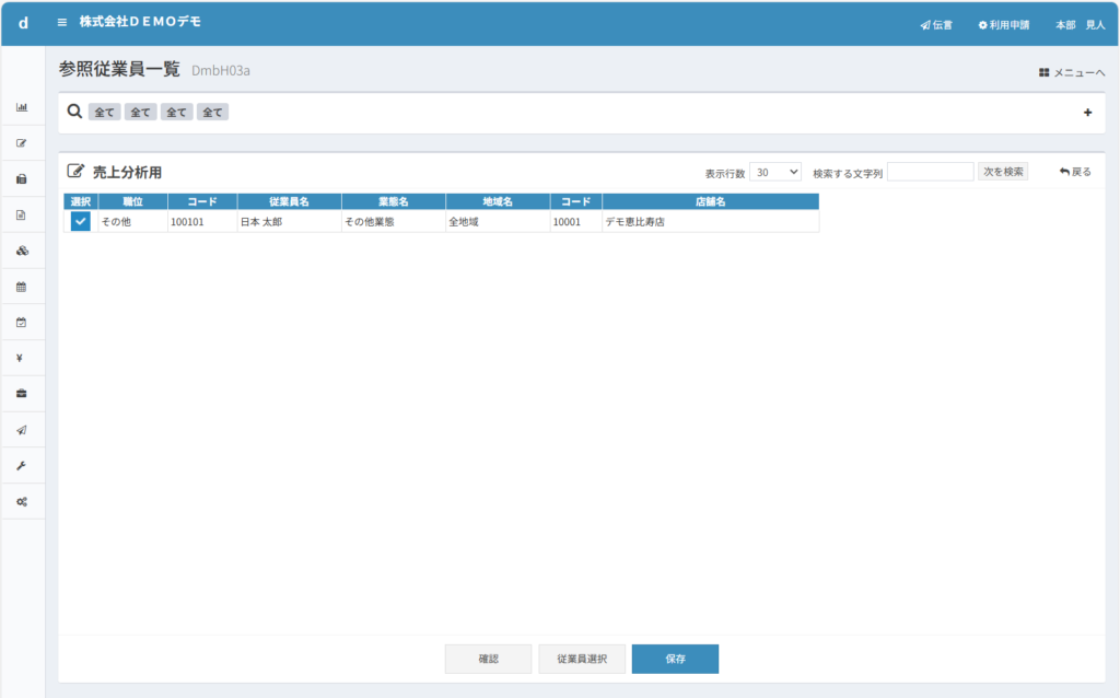 先に、このメニューを使用できるように参照従業員数の0人をクリックして、日本 太郎さんを登録します。従業員選択を押して、参照する従業員を選んで保存してください。
