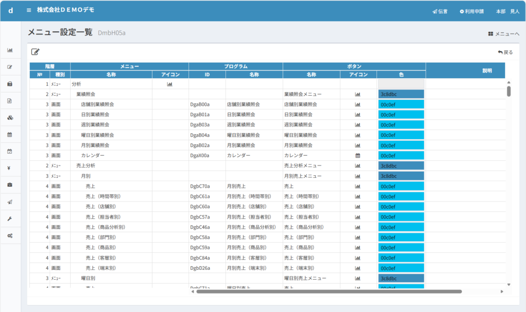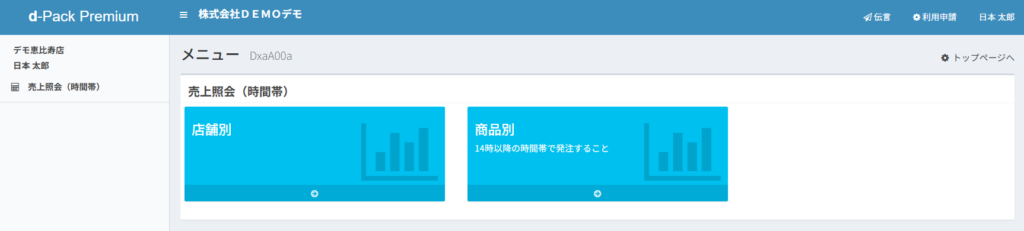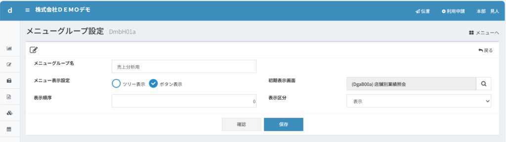 日本 太郎さんは、タブレット端末で売上分析を見ているので、メニュー表示をボタン表示に設定しました。また、ログインして最初に表示される画面を店舗別業績照会という画面に設定しています。