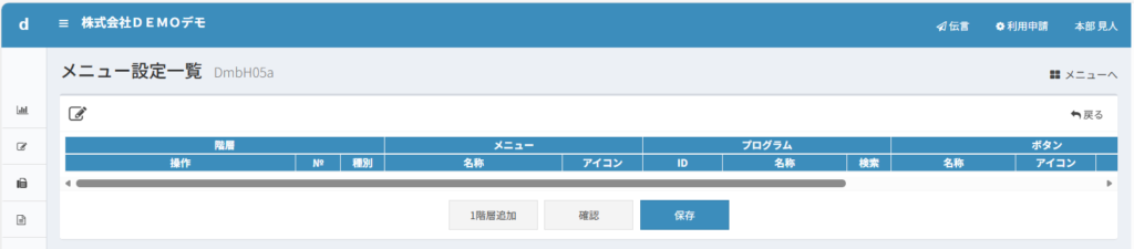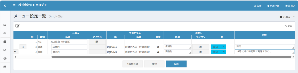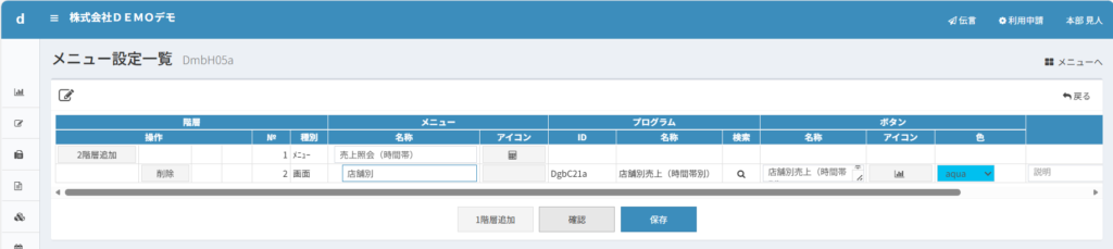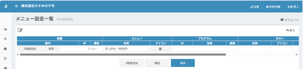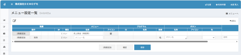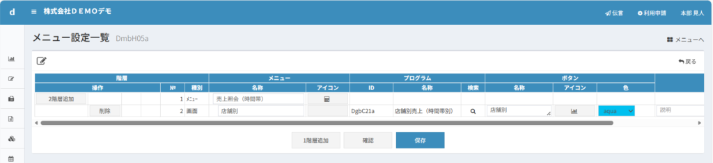 このままでは、まだメニューから画面を表示することができません。次に、2階層目を作成します。一番左側にある階層の操作項目にある「2階層追加」ボタンを押すと、階層No.2で種別メニューが追加されます。