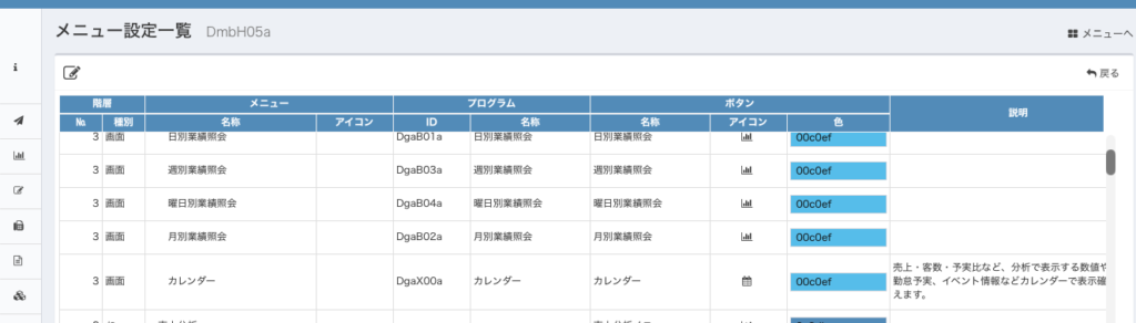 アイコンは、そのメニュー名の左側に表示されるアイコンです。下の画面例は、階層No.2までのメニュー名が表示されている例です。